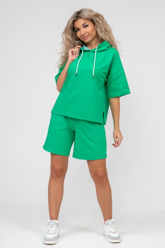 Women's suit 2-ka is made of high quality footer with cotton and a small addition of polyester and lycra, which allows the product not to roll down and leave a perfect appearance for a long time. The costume consists of a hoodie and shorts. Sweatshirt with a hood and a drawstring. The shoulder line is lowered, the sleeve is shortened, there are small slits on the sides. A loose fit will look great on ladies with any shape. The costume of this plan is presented in a wide size grid, which allows you to choose it for both a girl and a woman. A solid color suit of fashionable colors will be a good choice for vacation trips, picnics, outdoor activities and city walks. It will be perfectly combined with sneakers, as well as with shoes, ballet flats or sandals. Using this model as a home suit, you will understand that this is exactly the ideal option in which you will feel comfortable, comfortable and modern. A suit with shorts is a real godsend for those who value their individuality! Based on the table of measurements, please note that the length of the sleeve was measured from the point of the base of the neck.