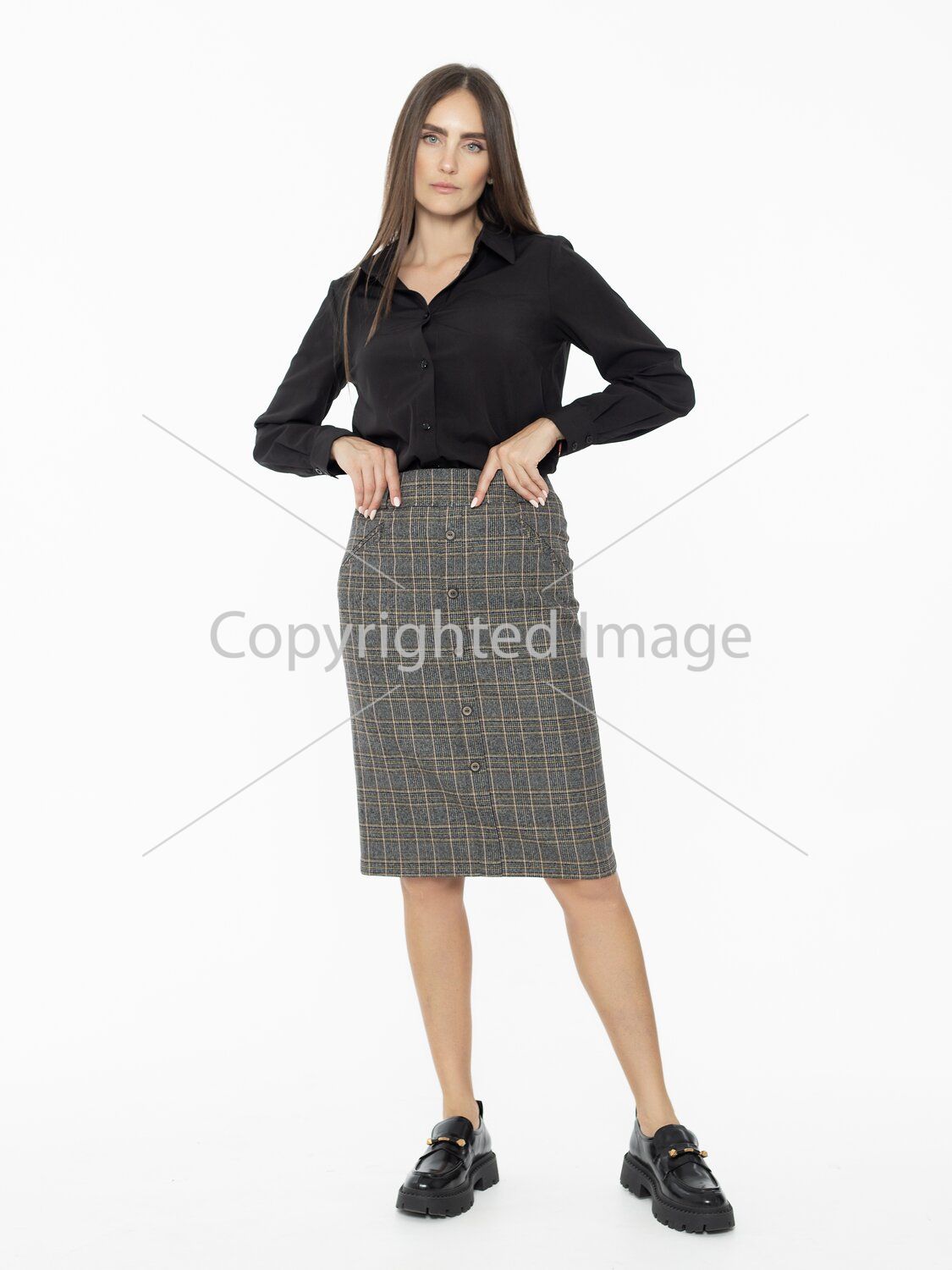 Women's skirt, straight silhouette, wide yoke, with a fitted belt, lined. The clasp is located at the back of the middle seam on a hidden braid zipper. On the sides of the front there are functional pockets fastened with hidden zippers, decorated with frames, along the middle seam the plank is fixed with stitches and buttons.